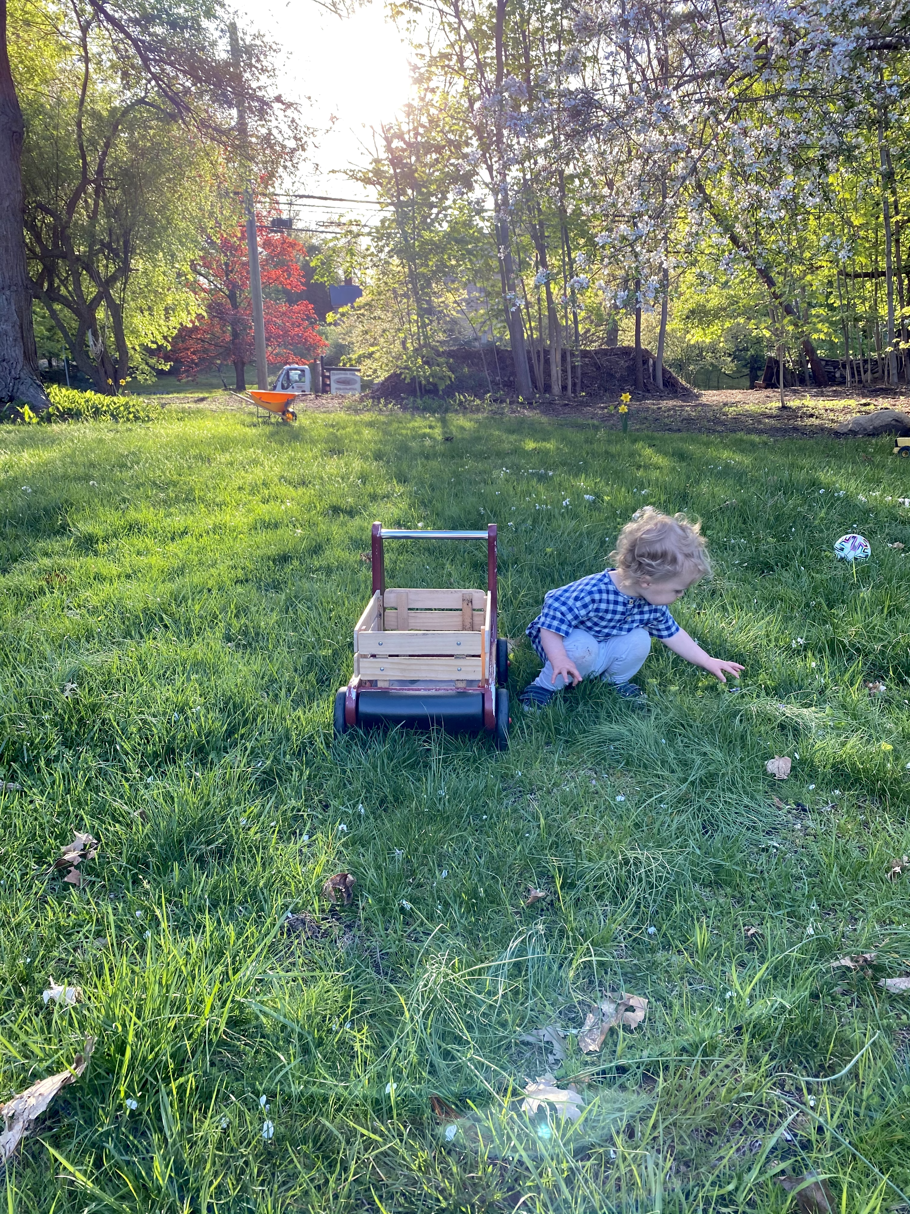The lawn, fresh with violets and slender clover and dandelions that Irving deposits, one by one, in his little red wagon.