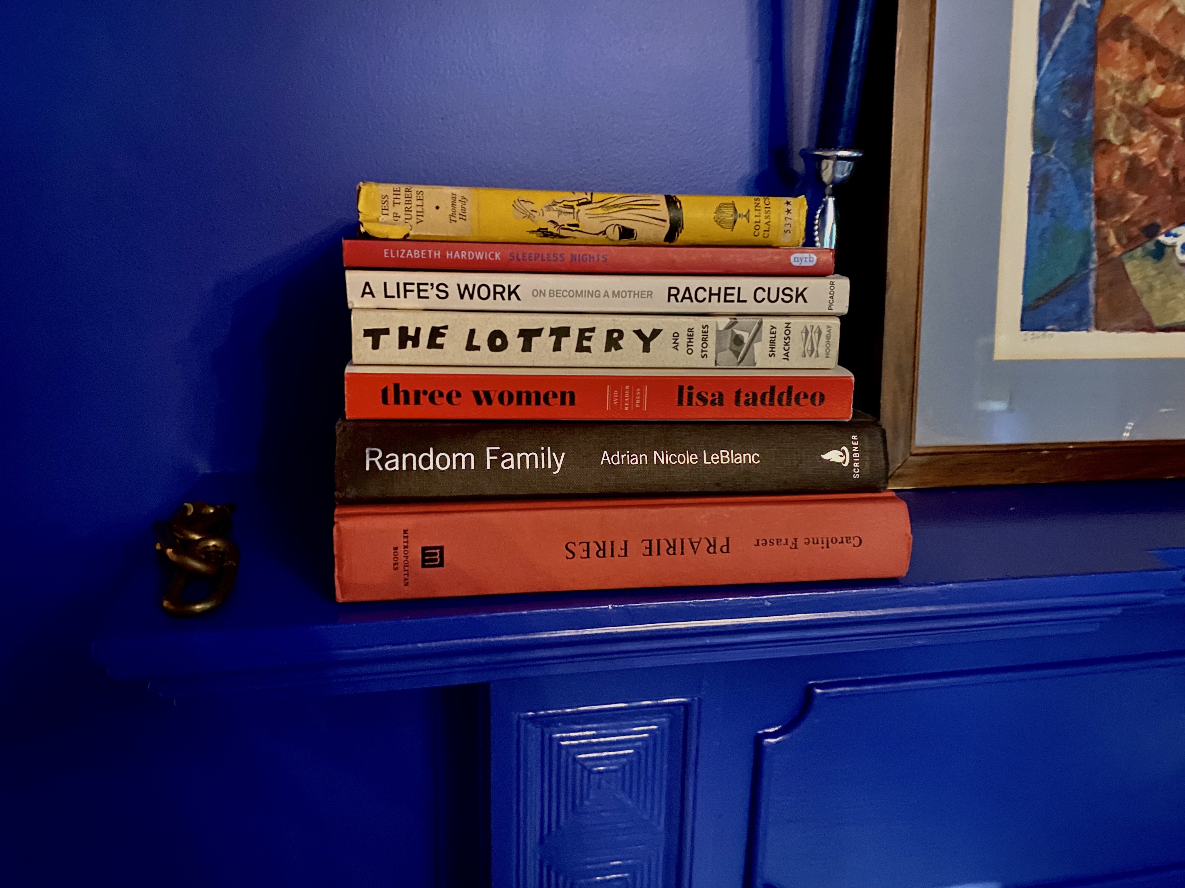 Because the bookstore shelved A Life’s Work in Memoir and The Argonauts in Essays, The Lottery in Short Stories, Three Women in nonfiction, I, arriving home, plucked them from my own, similarly categorized shelves and grouped them on the mantle. I added Middlemarch, Wide Sargasso Sea. A Manual for Cleaning Women, Ordinary Family. Prairie Fires and Monsieur Venus, and Tess of the D’ubervilles and A Room of One’s Own. When the mantle threatened to look overcrowded, I took a photo and texted it to a few of our book club’s founding members.