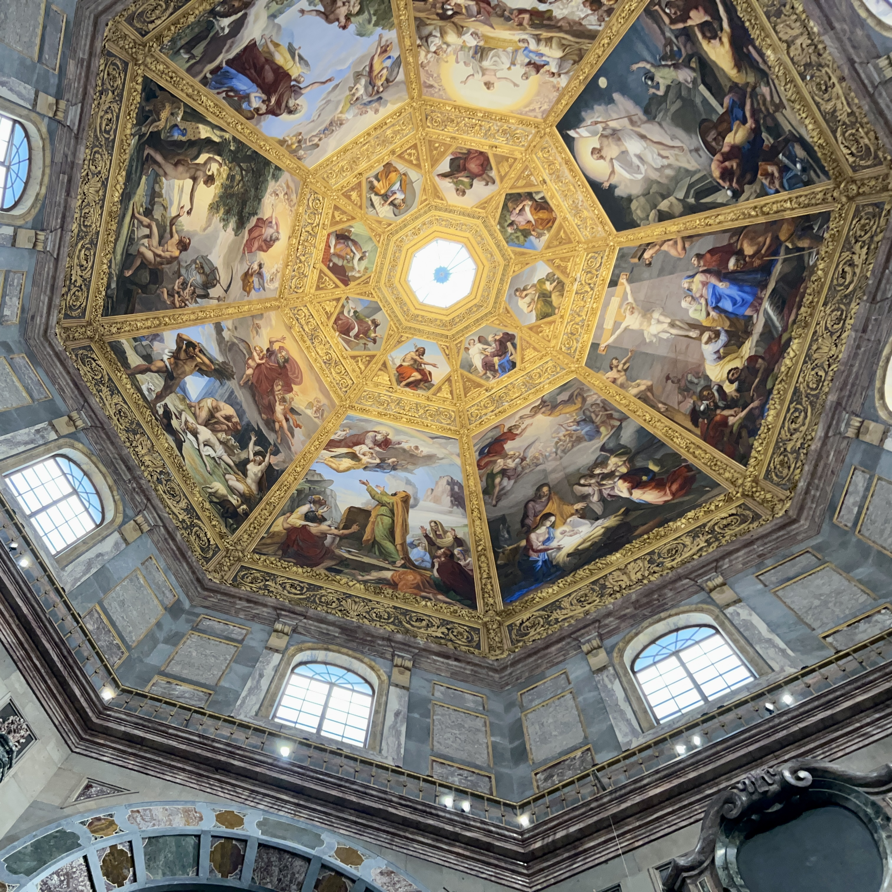 It is disorientating to pass from the sober, oysterly perfection of the sacristy into the chapel of the princes – like going from Khaite to Versace: here the marble runs to greens and ocean blue, inlaid with glinting maroon porphyry; the veins spider and bloom, the grandest of the free-standing sarcophagi, illustrated in lapis, jade, endless gold, hulks under a vast candelabra. The coffered domed ceiling – floridly, sumptuously frescoed, is designed to dazzle. The walls are paneled, carved; the princes super-sized. It is, to my mind, hideous (but no one could say it isn’t ambitious).