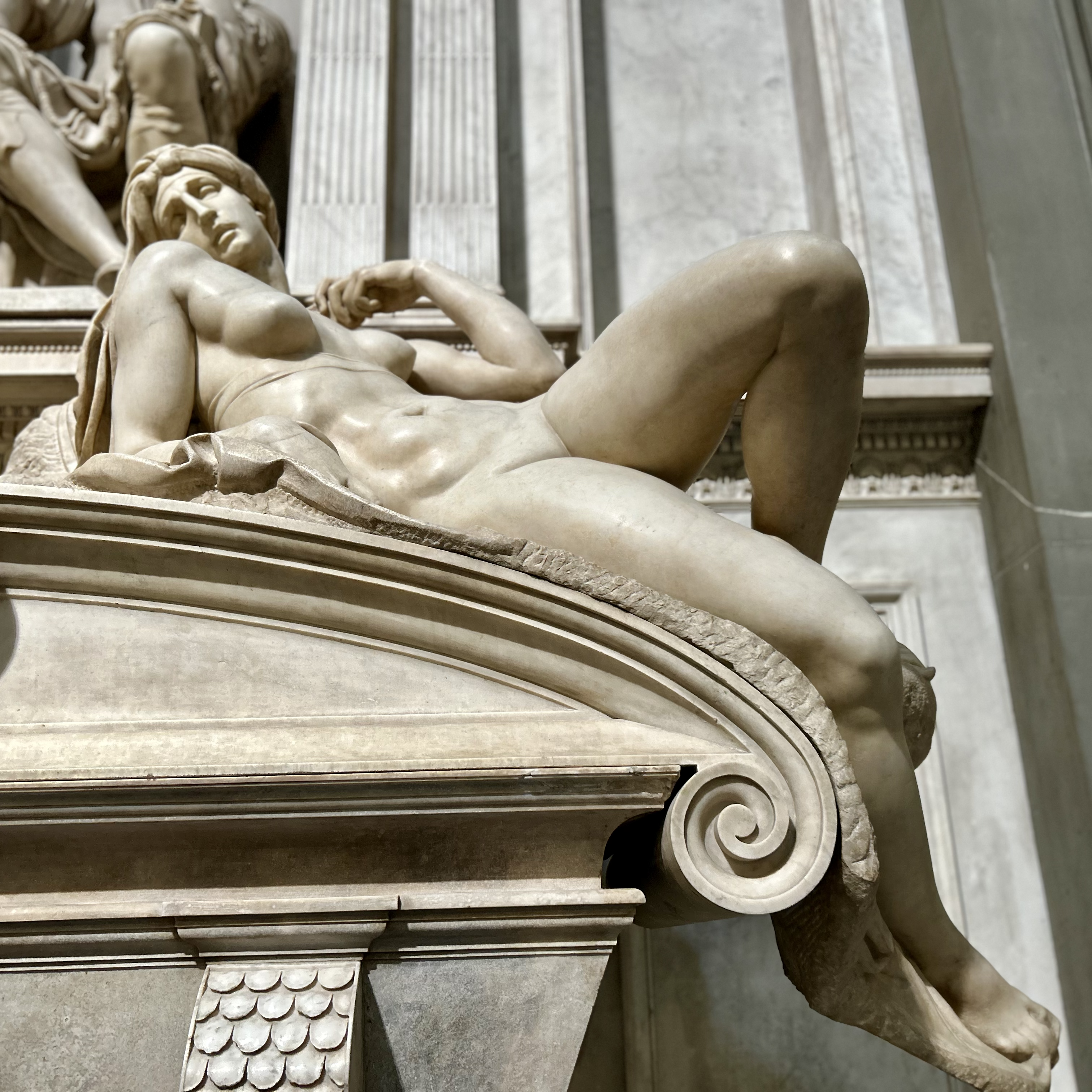 In the moment, I pick up on none of this. I am transfixed by the way the the light slides over the marble limbs, illuminating the faint divots of pectoral and breast, the fleshy bit I always have to mind when photographed in sleeveless dresses, of shoulder and bicep and languid thigh and toes flexed against rock. An alcove past Day holds a large, crucifix-topped dodecahedron. Most smiths stuck with orbs, but Michelangelo was insistent: a sixty-sided polyhedron is divine.