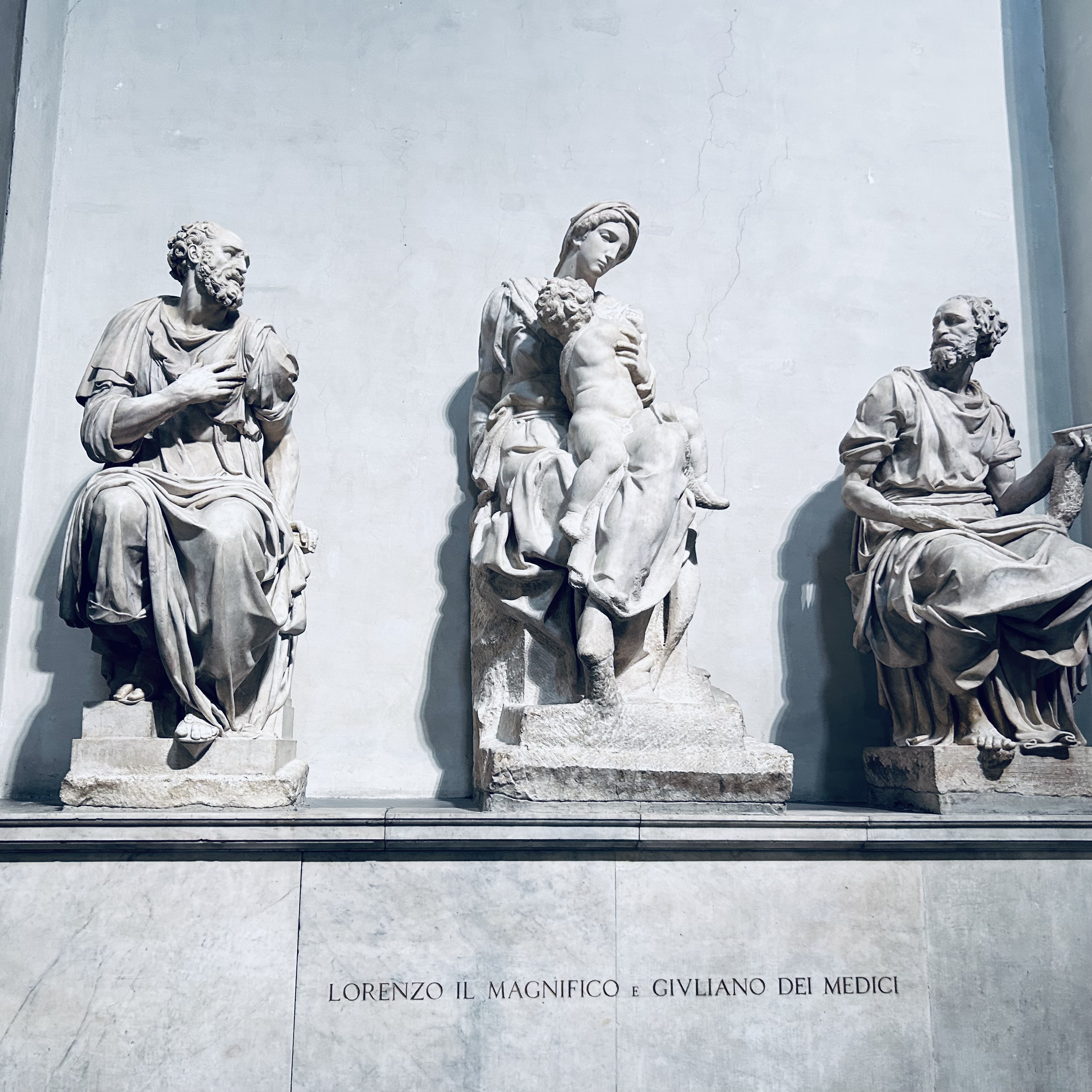 He carves the Duke of Medici and the second tomb. He oversees completion of the Duke of Nemours. Before the third sepulchre is constructed, he absconds to Rome. Lorenzo the Magnificent and his brother get a basic sarcophagus with three semi-random sculptures. The fourth wall remains blank. Nearly thirty years will pass before Cosimo Medici decides, the hell with it; it’s time for the chapel to come together. A project begun in earnest ends embittered.