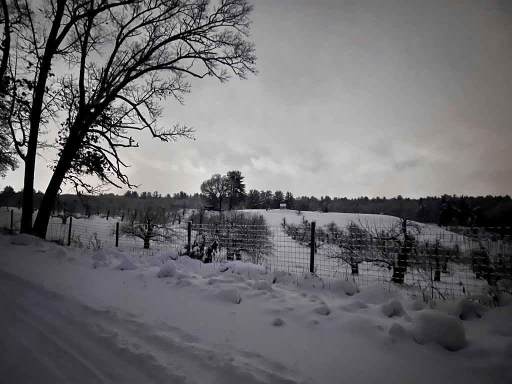The snow does fall. On Sunday night I snowshoe in passionfruit light through the silent town and up to the top of the orchard. It’s close to six when I leave – achingly, I’d watched the thin daylight fade from the kitchen window; I’m supervising Irving and Ottelie, the revolving doors in terms of snow play, and slowly making risotto with orange and shrimp. It is closing on six and dark and cloistered through town and up the forested hill but when I reach the ridge line, the light shifts; I can see all the way across the orchard.
