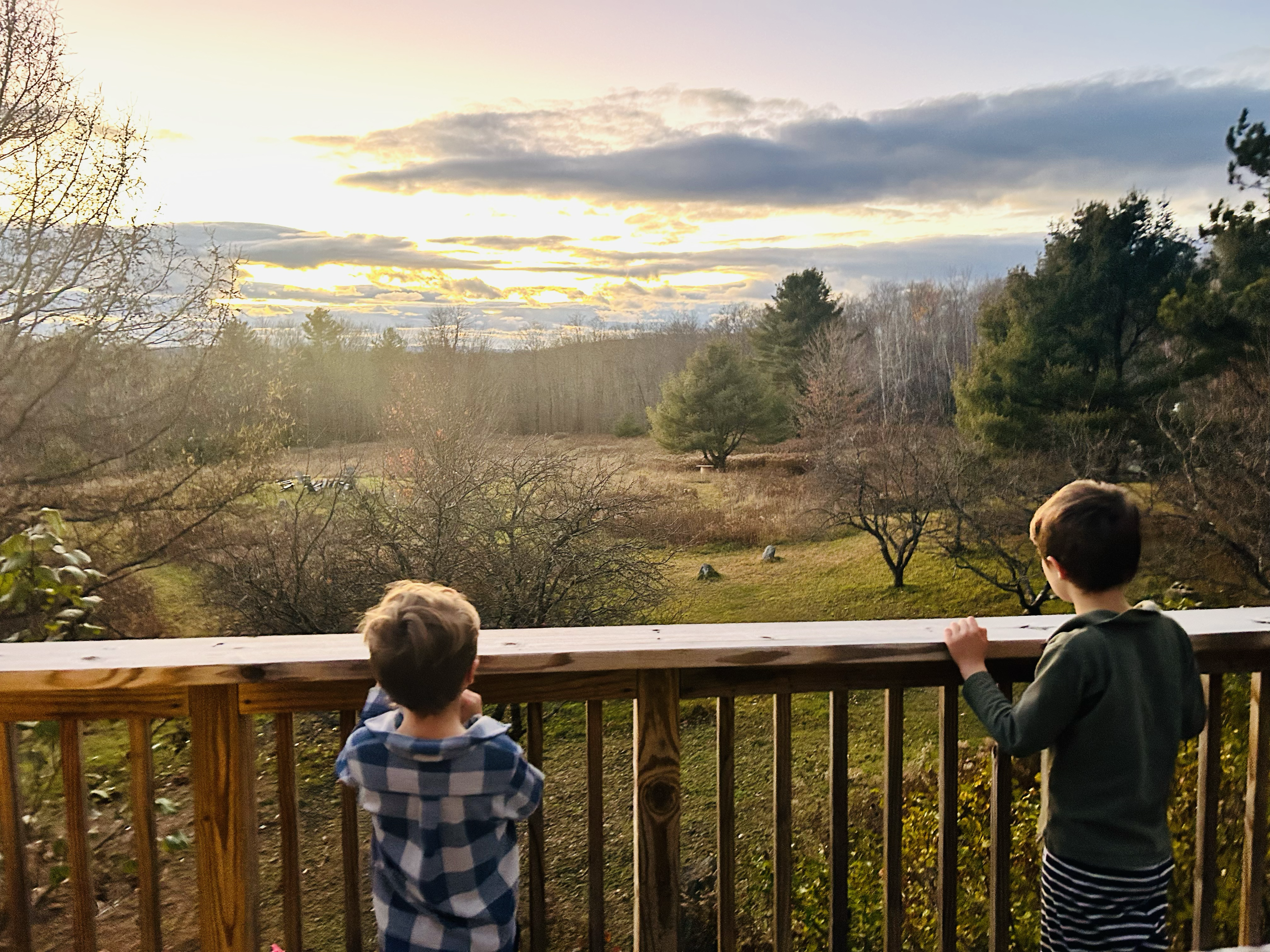 I relieve my mother and hold O for a little while, standing, enjoying the stillness of her. I sing the abbreviated version of the bedtime song my husband has made up for her; I turn off the lamp and, noticing the light bleeding from the boys’ closed door, go in and unplug the string of christmas lights.